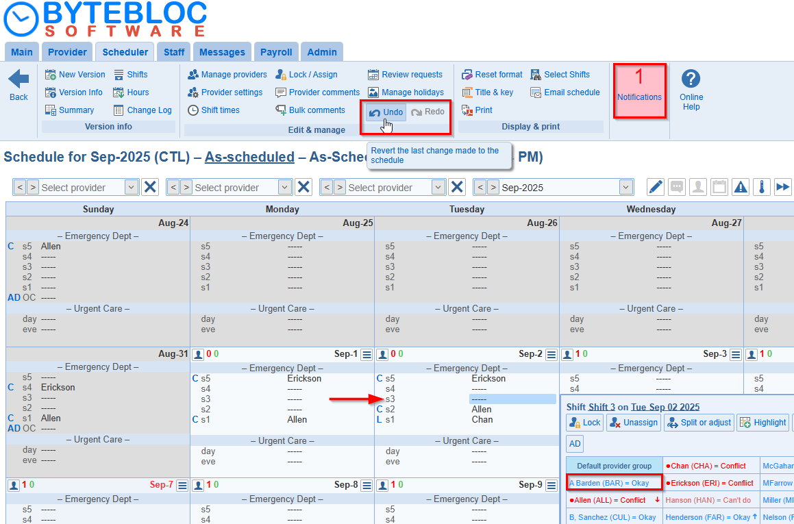 Undo & Redo: 'Undo' and 'Redo' are available in the revision screen for the assignments of shifts to providers. 'CTRL + Z' is the same as clicking 'Undo' and 'CTRL + Y' is the same as clicking 'Redo'. Automation, clearing the schedule, or changing the shifts in the schedule also resets the 'Undo' and 'Redo' functions.