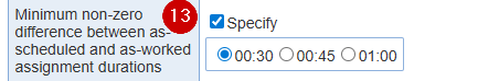 13. Minimum non-zero difference between as-scheduled and as-worked assignment durations: An option is available to constrain the difference between shift as-scheduled and as-worked hours to a minimum value. The time picker is unaffected by the option. The user will be notified if the time adjustment is less than the minimum allowed value as a validation error (e.g., for a minimum of 00:30, adjusting the start time back by 00:15 and the end time forward by 00:15 satisfies the 00:30 constraint). The validation occurs upon saving the time adjustment when the user is not an administrator. We can adjust so that the validation occurs when administrators edit the hours.