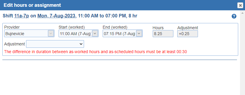 9. Allow providers to add themselves to unscheduled shifts as pure adjustment providers: In the 'Edit hours or assignment' option to add themselves as 'Pure adjustment' provider for unscheduled shifts.