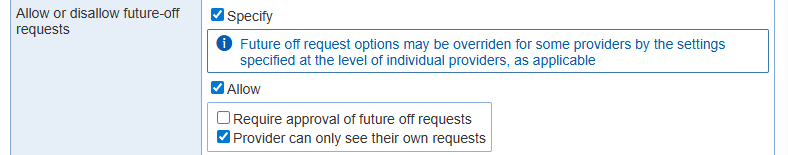 5. Allow or disallow future-off requests: Hide 'Future off Requests' menu based on provider group, 'Allow', 'Require approval of future off request' or 'Provider can only see their own requests'.